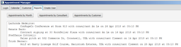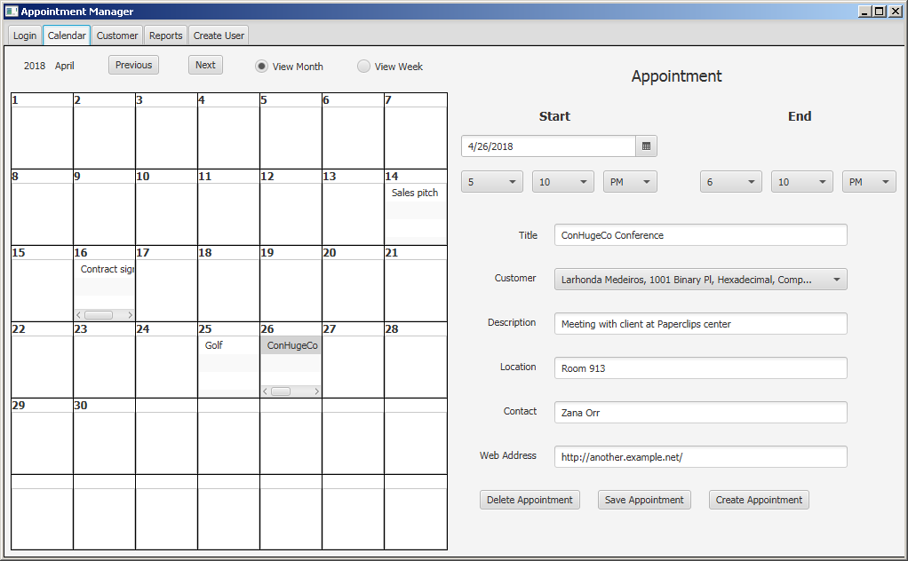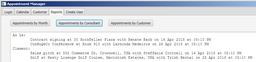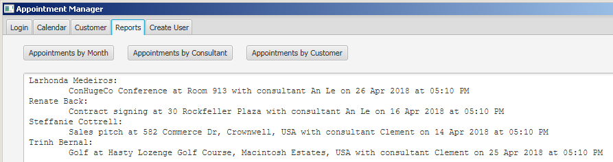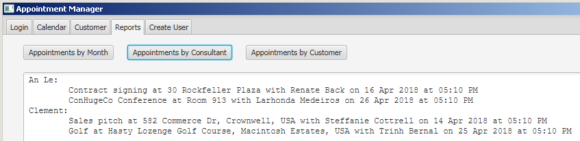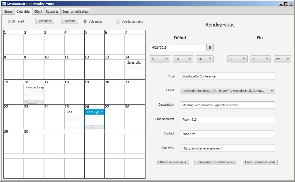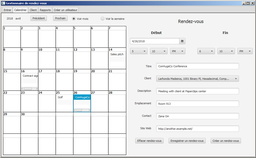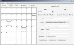 Appointment Manager allows the user to manage the schedules of multiple salespeople, each with multiple, possibly overlapping lists of clients. It automatically prevents scheduling multiple appointments for the same salesperson simultaneously. Both English and French localizations are available, and the user can switch between the two without restarting the application.