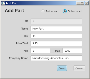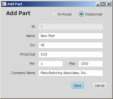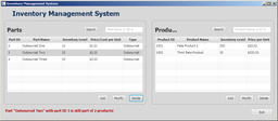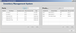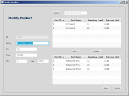 Inventory Manager demonstrates data storage with MySQL; maintaining referential integrity by warning the user when they attempt to delete a part that belongs to existing products; UI input validation; and a multiple-window interface.