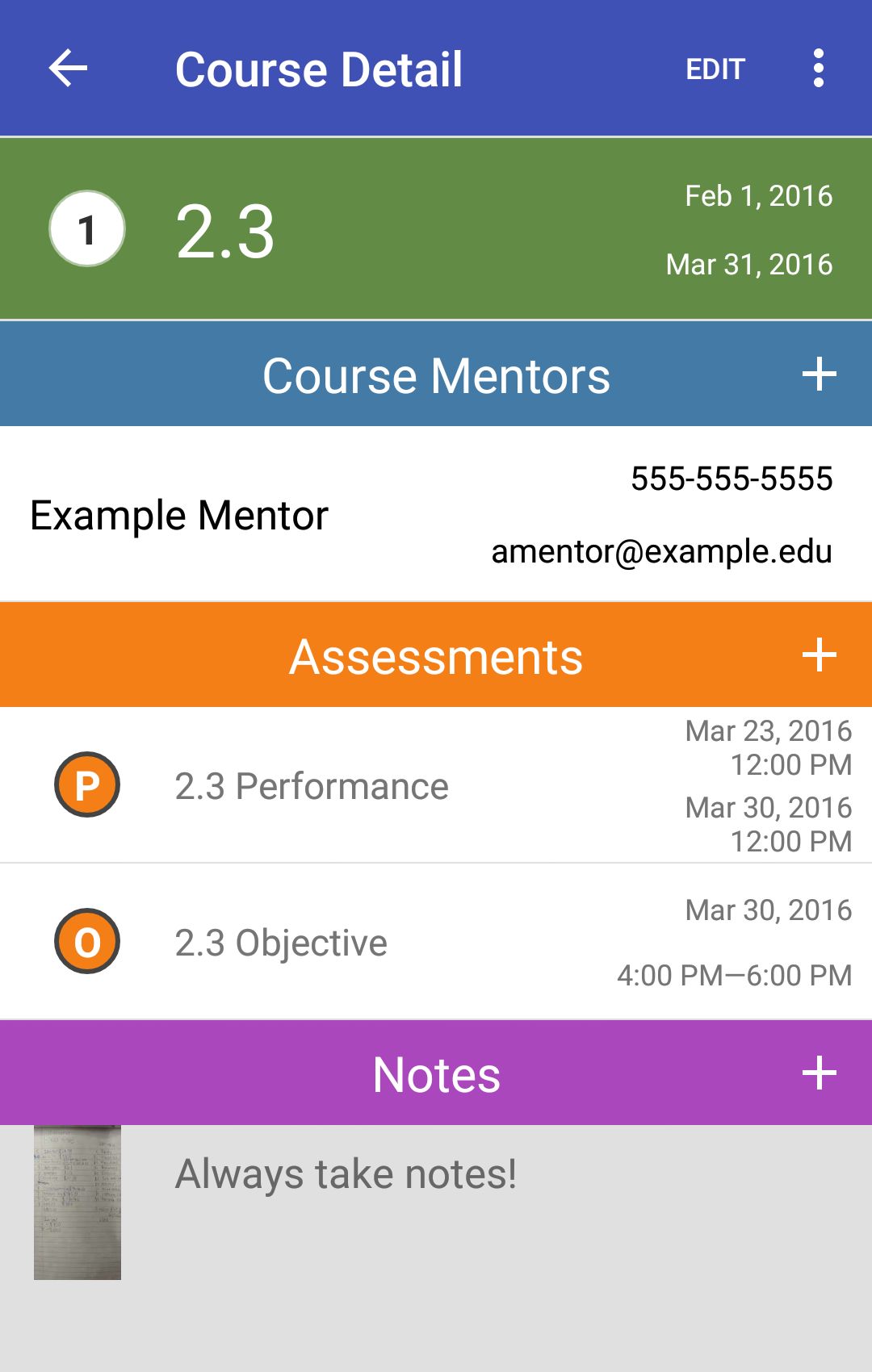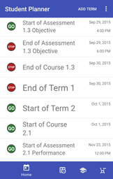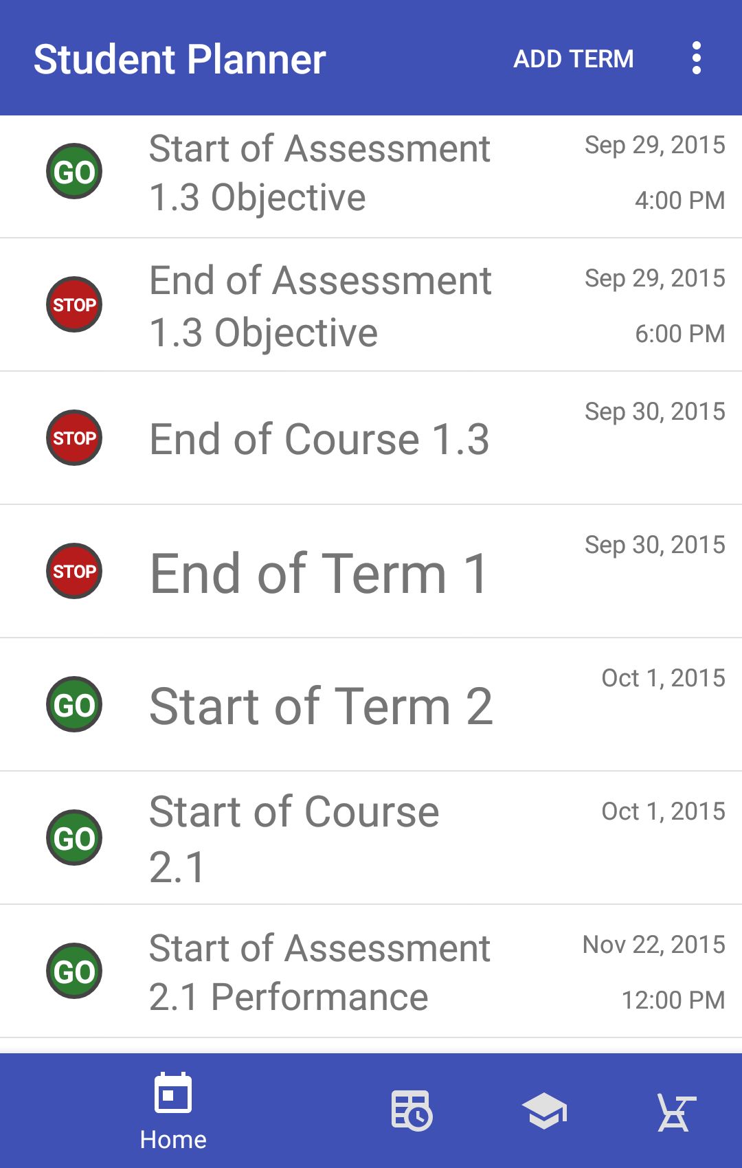 Student Planner is an Android application for a student to schedule their terms, courses, and assessments (tests). It allows the student to attach notes to their courses and assessments with optional photos, add assessment times to their calendars, and share notes and photos with others.